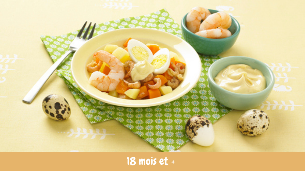 Dressez l’ensemble des ingrédients dans des petits bols ; les crevettes, l’œuf, les légumes et la mayonnaise, sur un joli plat.